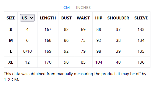 - Bust: 82cm / 32.3" Waist: 64cm / 25.2" Hips: 96cm / 37.8"