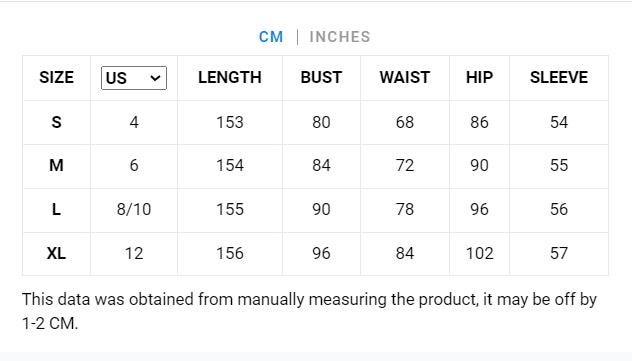 - Bust: 86cm / 33.9" Waist: 62cm / 24.5" Hips: 96cm / 37.8"
